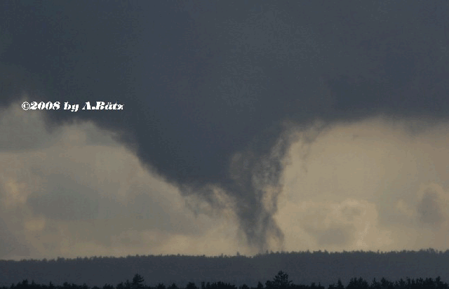 Es folgen ein kurzer Bericht und zahlreiche Fotos von Alex Bätz: "Ich habe am Montag, 22.09.2008 über dem Gebiet von LAUF AN DER PEGNITZ so gegen 17 Uhr/ 17 Uhr 30 ein Wetterphänomen beobachtet und gleich zur Kamera gegriffen. Es war eine deutliche Drehung von Luftmassen zu beobachten und eine Bewegung von Wolkenfetzen nach oben sichtbar. Mein Standort befindet sich in Lauf an der Bahnlinie links der Pegnitz, auf Höhe des S-Bahn Haltepunktes "West". Blickrichtung ging nach West/Südwest (Richtung Nürnberg). Der Funnel stand geschätzt über dem OT Wetzendorf. Ersten Sichtkontakt hatte ich so gegen 17 Uhr, er löste sich zwischendurch auf und entstand an anderer Stelle neu. Ich glaube, es waren mehrere Ansätze vorhanden. Das ganze Schauspiel hielt so ca. 20 - 30 Minuten. Ich konnte keine hochgewirbelten Partikel oder Gegenstände ausmachen."