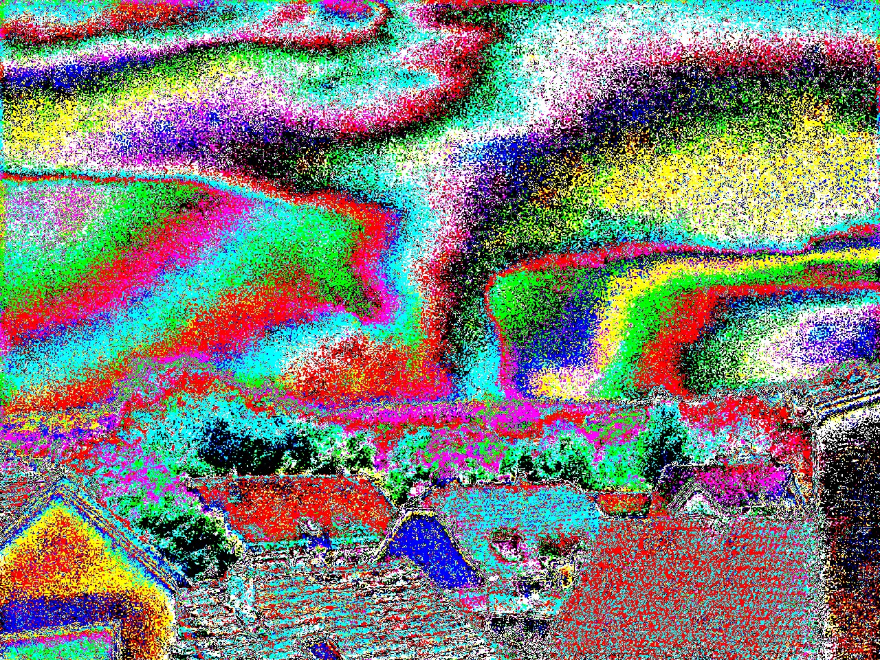 | Es folgt noch eine Darstellung der Bit-Ebenen des Bildes. Dafür wurde das Bild auf die RGB-Basisfarbkomponenten reduziert und die Farbtonänderungen im Bild mithilfe von Volltonfarben dargestellt (Originalgröße). |