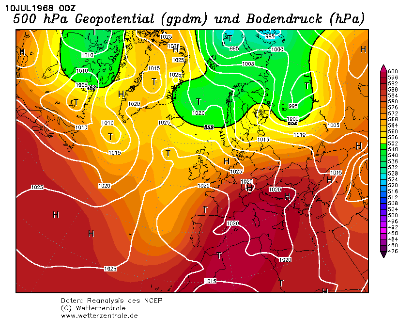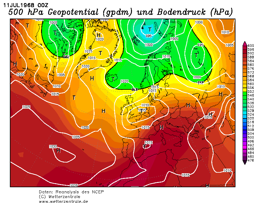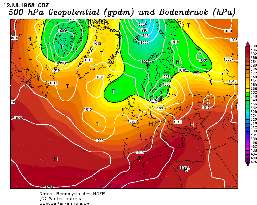 Wetterlage um den 10.07.1968: Am 10. Juli 1968 entstand im Bereich Portugal - Nordwestspanien ein Tief, das mit Nordostkurs über die Biskaya, Nordfrankreich, den Ärmelkanal und die Benelux-Staaten hinweg bis zum 11. Juli nach Norddeutschland zog. An seiner Ostseite gelangte sehr warme und feuchte Mittelmeerluft in den Süden und in die Mitte Deutschlands. So stieg die Temperatur am 10. Juli z.B. in Karlsruhe bis 30,6 Grad und in Stuttgart bis 29,6 Grad, während an der Nordseeküste nur Werte um 15 Grad erreicht wurden. Die Kaltfront des Tiefs griff von Westen her auf Deutschland über. Im Bereich der Kaltfront und vorlaufend bildeten sich teils heftige Gewitter, die vielerorts mit Starkregen, Hagel und Sturmböen verbunden waren. Eine dieser kräftigen Gewitterzellen überquerte mit Ostkurs zunächst die Vogesen in Frankreich und dann den Schwarzwald auf deutscher Seite des Rheins. In ihrem Bereich entstand unter günstigen Bedingungen (mit der Höhe drehender und stärkerer Wind) der Pforzheimer Tornado. Die nebenstehenden Karten zeigen die Wetterentwicklung vom 10.07., 01 Uhr MEZ, bis zum 12.07., 01 Uhr MEZ. Zu erkennen ist das Tief, das unter erheblicher Verstärkung von Südwesteuropa bis zur Ostsee zog. Dort wurde das Tief zu einem kleinräumigen Sturmtief, auf dessen Rückseite aus Nordwesten deutlich kühlere Luft nach Mitteleuropa wehte. Ähnliche Wetterlagen haben schon mehrfach in der Region um Pforzheim schwere Gewitter und auch Tornados ausgelöst. Bekannt ist u.a. ein Fall aus dem Jahre 1952, als am 13. August ein Tornado in einem Stadtteil Pforzheims erhebliche Gebäudeschäden anrichtete. Der jüngste Fall ereignete sich am 08. Juli 2003, als durch einen Wirbel Schäden am Bahnhof entstanden. Allerdings ist in diesem Fall nicht ganz klar, ob es sich um einen Tornado handelte oder nur um eine kleinräumige und kurzzeitige Verwirbelung am Bahnhofsgebäude. Der Pforzheim-Tornado im Juli 1968 war zwar der bisher bekannteste Tornado der Stufe F4 in Deutschland, es sind aber eine ganze Reihe weiterer Tornados aus Deutschland und aus den Nachbarländern bekannt, die zum Teil sogar noch stärker waren. Allerdings wurden dabei meistens nur kleinere Orte getroffen und keine größeren Städte wie Pforzheim. Der letzte bisher bekannte F4-Tornado in Deutschland ereignete sich am 24. Mai 1979 (Pfingstmontag) im Süden Brandenburgs. Damals wurden sogar schwere Mähdrescher durch die Luft gewirbelt. |